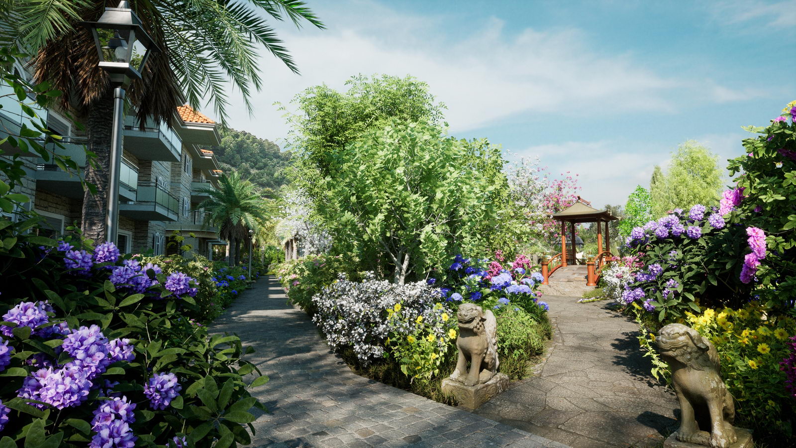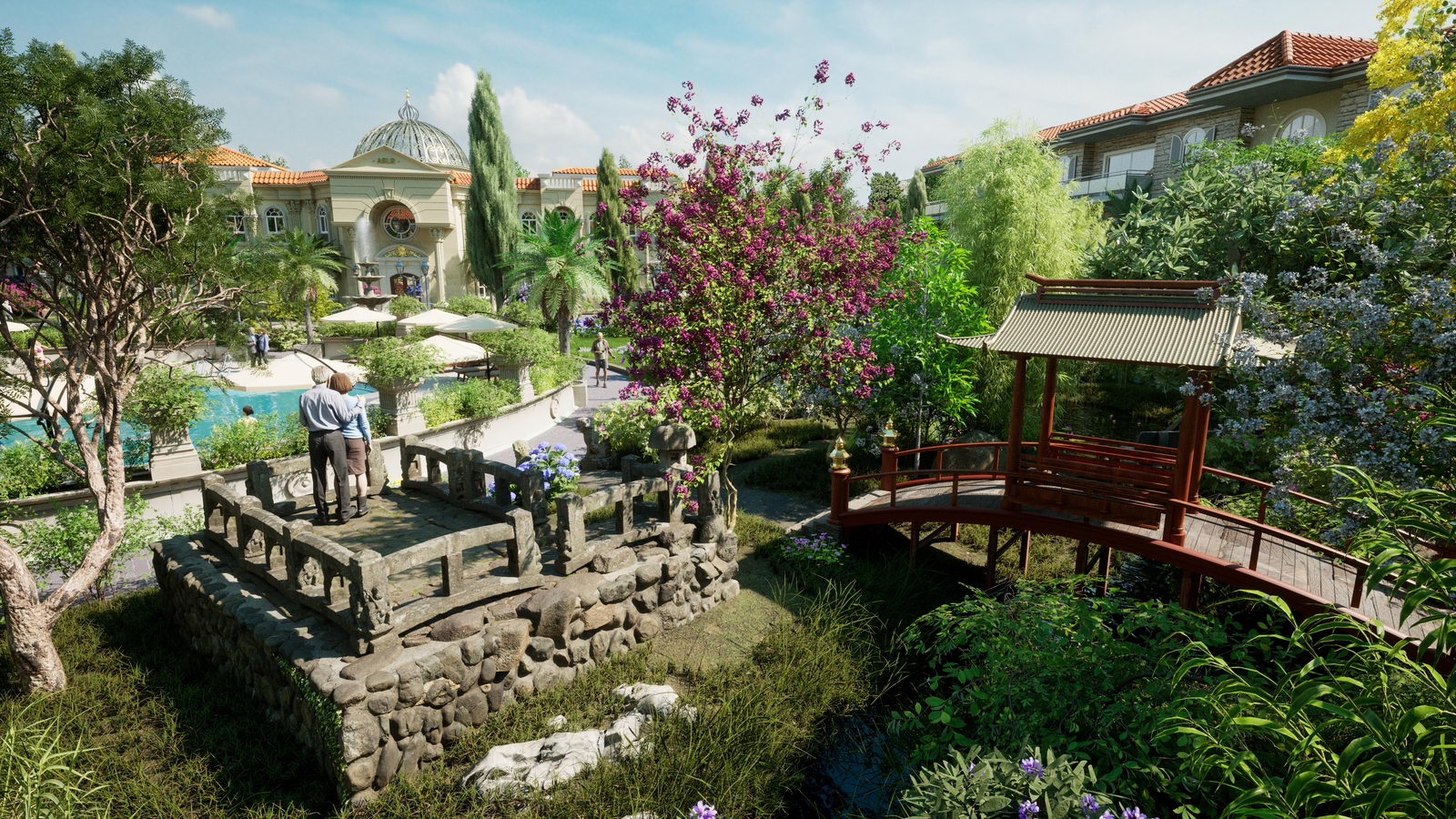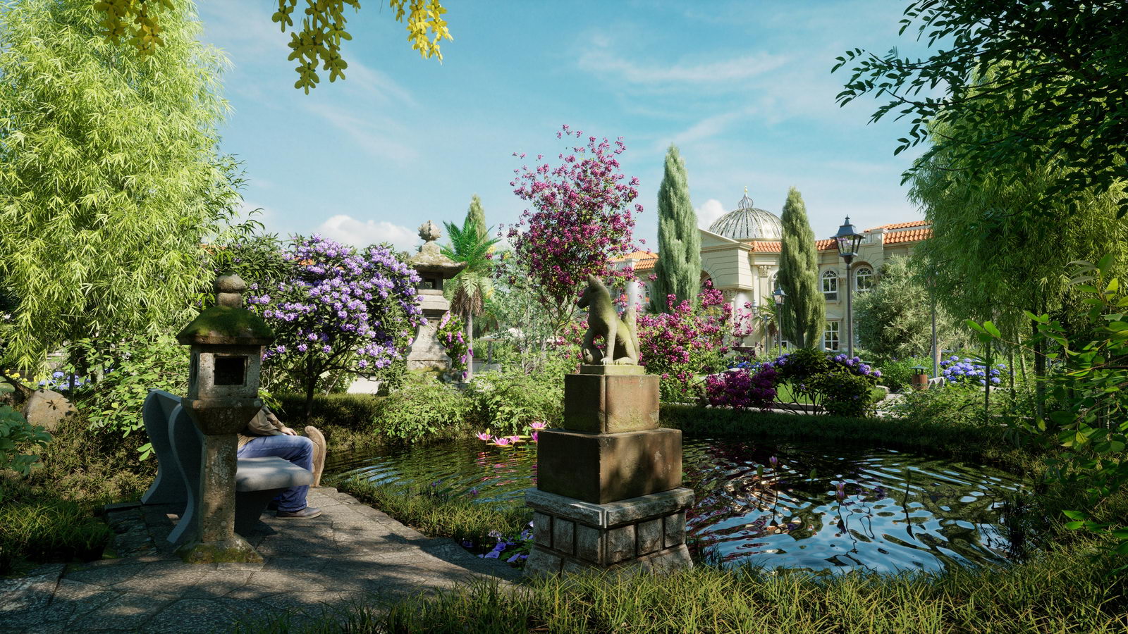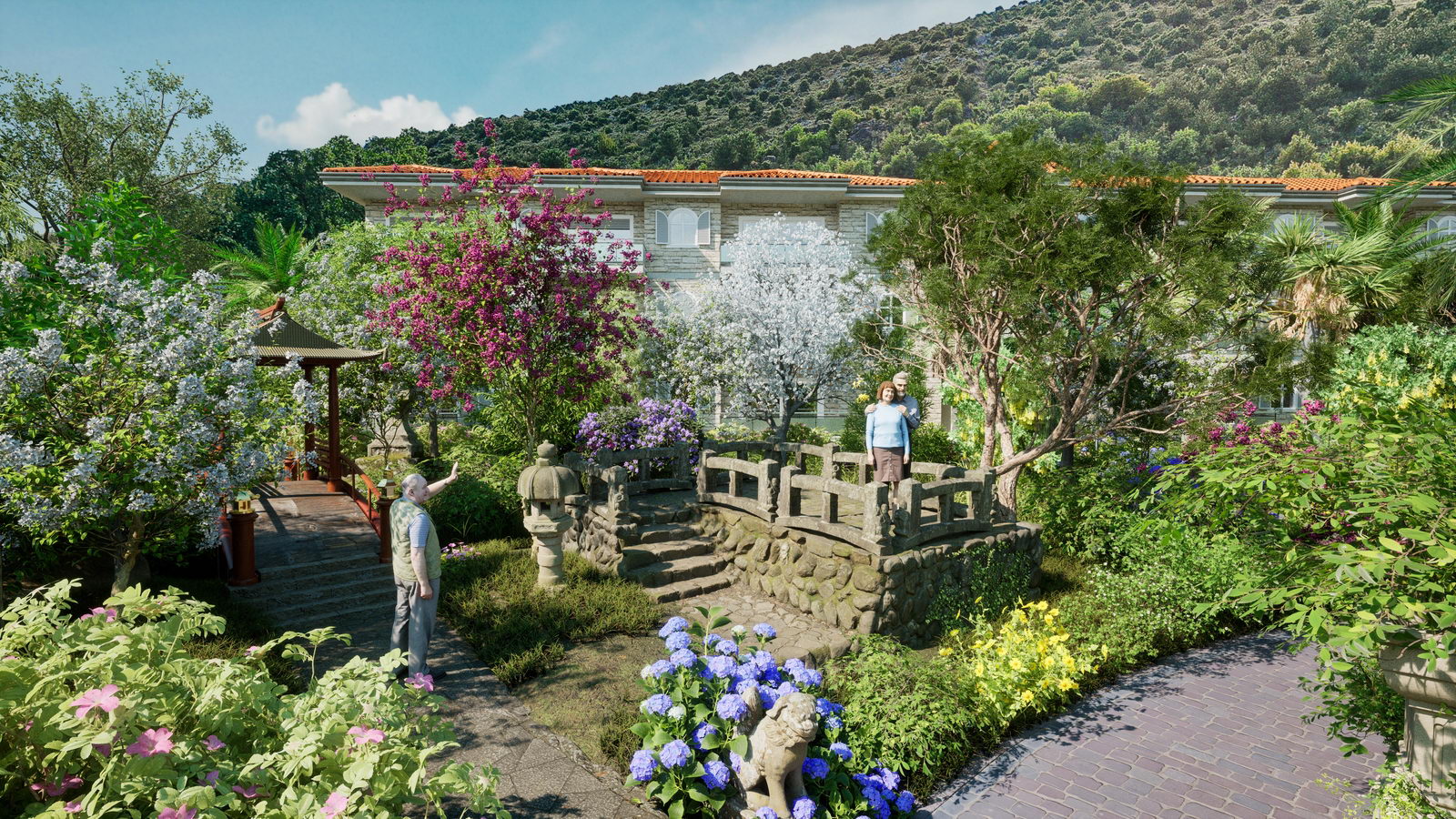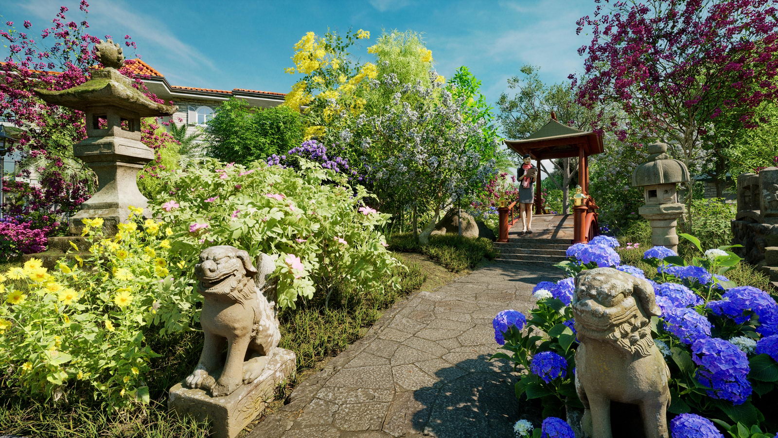 Der japanische Garten ist überwiegend gespickt mit landesüblicher Bepflanzung, kleinem Fischteich und traditionellen Steinfiguren. Dort wo Vögel und Schmetterlinge bei klarem Himmel und angenehmen Temperaturen ihre anmutige Erscheinung offenbaren und Blumendüfte zur Wonne für den Besucher werden.