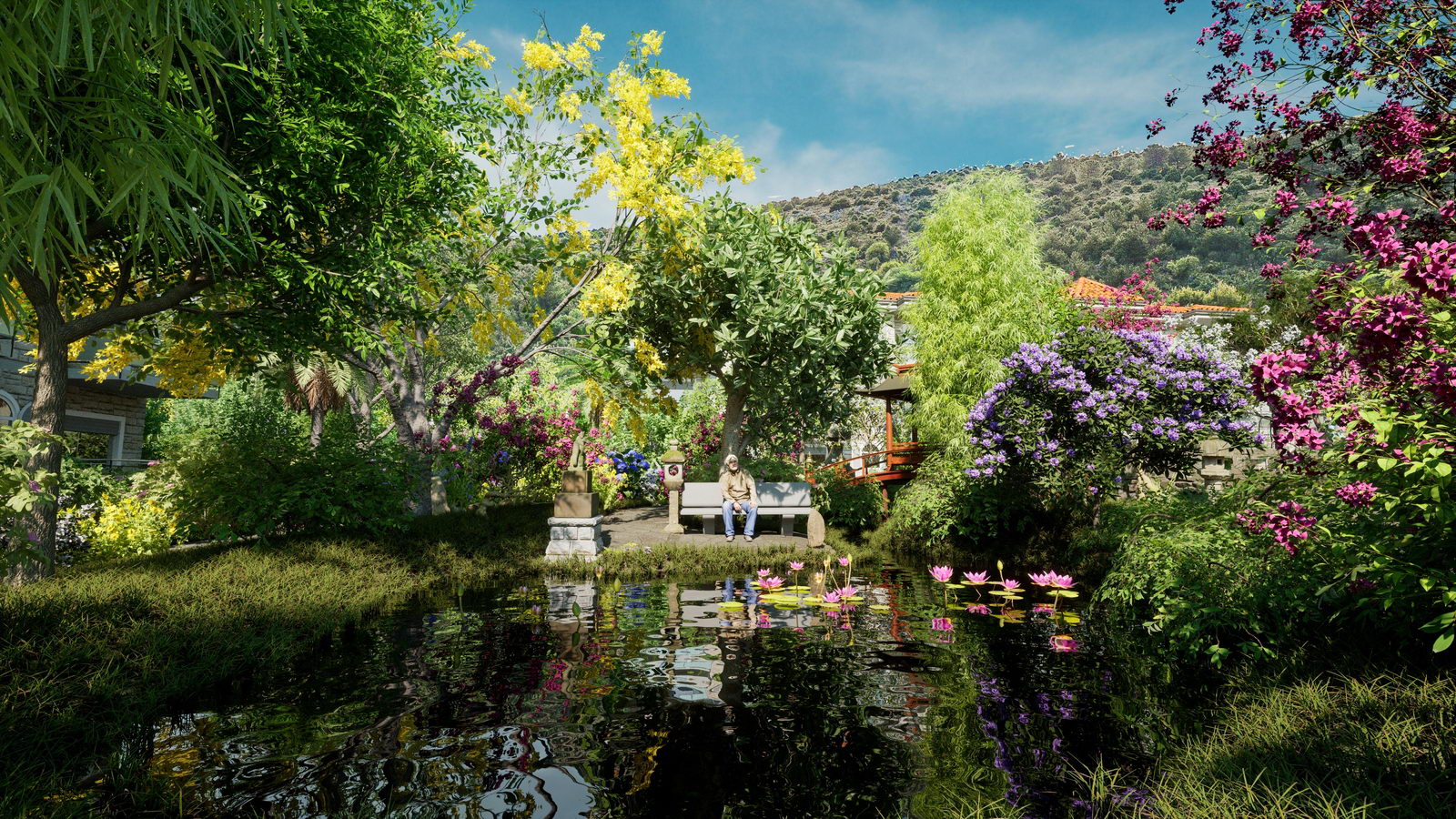 Dort wo der Baumschatten über einer Parkbank zum Lauschen plätschernder Fische einlädt oder wo die kleine Aussichtsplattform den Blick über die Pflanzenwelt anbietet, befindet sich ein kleines Paradies mit fernöstlichem Flair für romantische Zweisamkeit oder sinnlicher Einsamkeit.